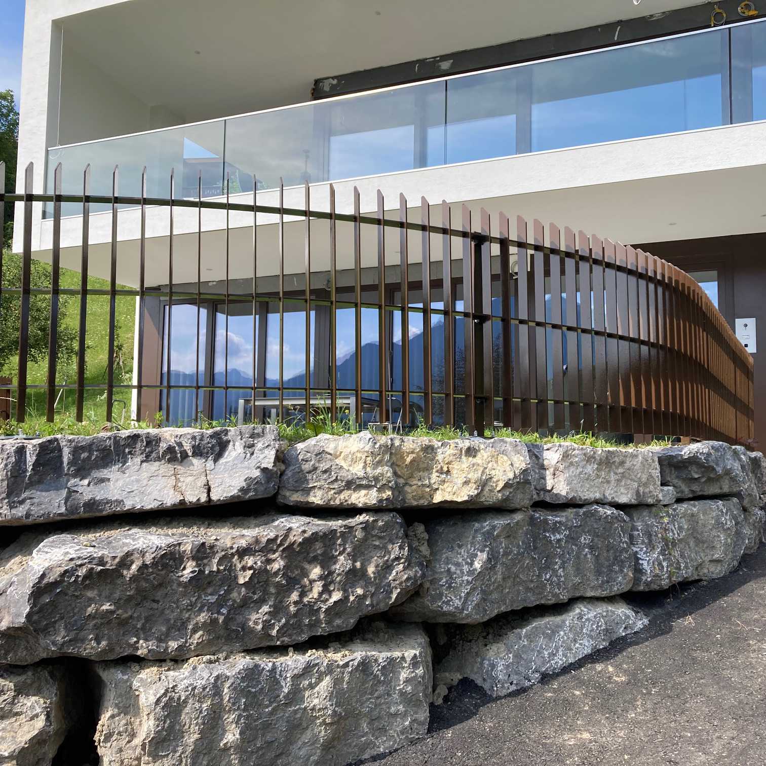 Ein elegant geschwungener Metallzaun schmiegt sich an einen Sockel aus Natursteinen und schafft so eine einzigartige Verbindung zwischen modernem Design und ursprünglicher Schönheit.